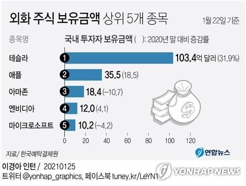 (서울=연합뉴스) 김태종 기자 = 국내 투자자들의 테슬라 주식 보유 가치가 새해 들어 100억달러를 넘어선 것으로 나타났다. 테슬라 주가가 오른 데다 '서학 개미'들의 주식 매집도 계속되고 있기 때문이다.