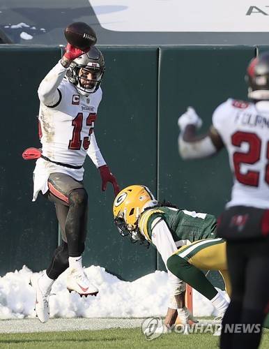 epa08963143 Tampa Bay Buccaneers wide receiver Mike Evans (L) celebrates a touchdown reception against the Green Bay Packers in the first quarter of their NFL NFC Championship game at Lambeau Field in Green Bay, Wisconsin, USA, 24 January 2021. The winner will go on to face either the Buffalo Bills or the Kansas City Chiefs in Super Bowl LV in Tampa Bay, Florida on 07 February 2021. EPA/TANNEN MAURY