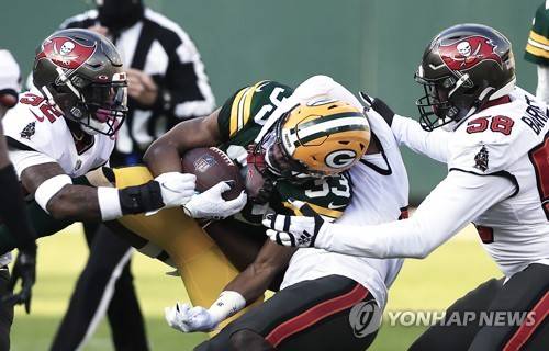 epa08963144 Green Bay Packers running back Aaron Jones (C) is tackled bya trio of Tampa Bay Buccaneers in the first quarter of their NFL NFC Championship game at Lambeau Field in Green Bay, Wisconsin, USA, 24 January 2021. The winner will go on to face either the Buffalo Bills or the Kansas City Chiefs in Super Bowl LV in Tampa Bay, Florida on 07 February 2021. EPA/TANNEN MAURY