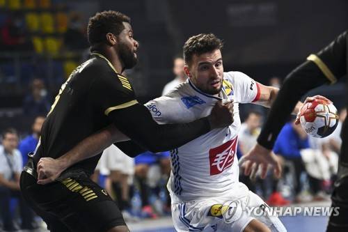 epa08963155 Portugal's Alexis Borges (L) in action against France's Nedim Remili (R) during the Main Round match between Portugal and France at the 27th Men's Handball World Championship in Giza, Egypt, 24 January 2021. EPA/Anne-Christine Poujoulat / POOL