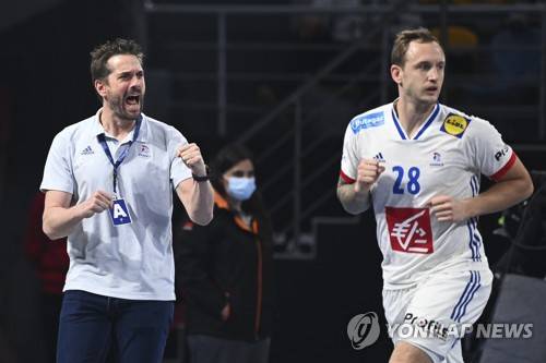 epa08963167 France's head coach Guillaume Gille (L) reacts during the Main Round match between Portugal and France at the 27th Men's Handball World Championship in Giza, Egypt, 24 January 2021. EPA/Anne-Christine Poujoulat / POOL