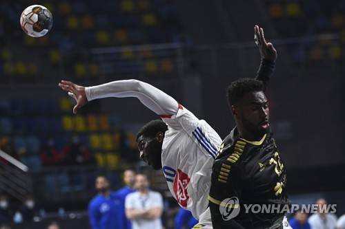epa08963171 France's Dika Mem (L) in action against Portugal's Alexis Borges (R) during the Main Round match between Portugal and France at the 27th Men's Handball World Championship in Giza, Egypt, 24 January 2021. EPA/Anne-Christine Poujoulat / POOL