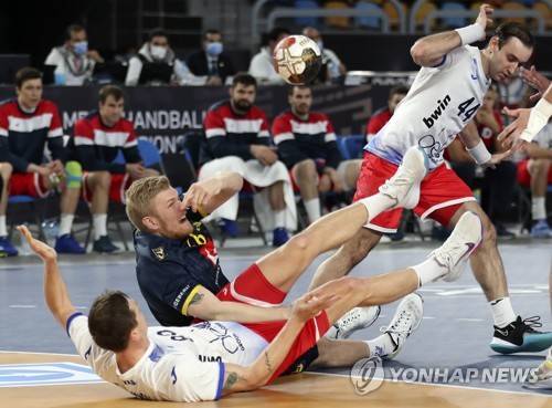epa08963172 Linus Persson (C) of Sweden in action against Mark Sergei Kosorotov (bottom) of Russia during the Main Round match between Russia and Sweden at the 27th Men's Handball World Championship in Cairo, Egypt, 24 January 2021. EPA/Mohamed Abd El Ghany / POOL