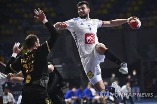 epa08963194 Portugal's Daymaro Salina (L) in action against France's Nedim Remili (R) during the Main Round match between Portugal and France at the 27th Men's Handball World Championship in Giza, Egypt, 24 January 2021. EPA/Anne-Christine Poujoulat / POOL