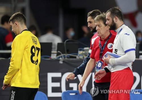 epa08963221 Russia's coach Velemir Petkovic (2-R) and his players react after the Main Round match between Russia and Sweden at the 27th Men's Handball World Championship in Cairo, Egypt, 24 January 2021. EPA/Mohamed Abd El Ghany / POOL