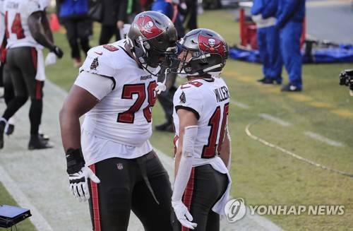 epa08963243 Tampa Bay Buccaneers wide receiver Scotty Miller (R) celebrates with teammate Tristan Wirfs (L) after catching a touchdown pass against the Green Bay Packers with one second on the clock in the second quarter of their NFL NFC Championship game at Lambeau Field in Green Bay, Wisconsin, USA, 24 January 2021. The winner will go on to face either the Buffalo Bills or the Kansas City Chiefs in Super Bowl LV in Tampa Bay, Florida on 07 February 2021. EPA/TANNEN MAURY
