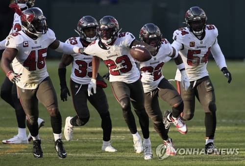 epa08963245 Tampa Bay Buccaneers cornerback Sean Murphy-Bunting (C) celebrates with teammates after an interception against the Green Bay Packers in the second quarter of their NFL NFC Championship game at Lambeau Field in Green Bay, Wisconsin, USA, 24 January 2021. The winner will go on to face either the Buffalo Bills or the Kansas City Chiefs in Super Bowl LV in Tampa Bay, Florida on 07 February 2021. EPA/TANNEN MAURY