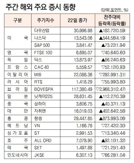 [표]주간 해외 주요 증시 동향(1월 18일~22일)