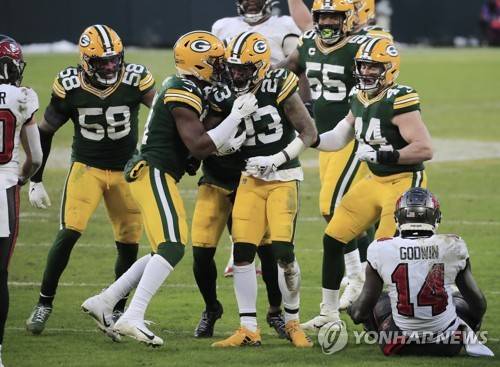 epa08963291 Green Bay Packers Jaire Alexander (C, 23) celebrates an interception against the Tampa Bay Buccaneers in the third quarter of their NFL NFC Championship game at Lambeau Field in Green Bay, Wisconsin, USA, 24 January 2021. The winner will go on to face either the Buffalo Bills or the Kansas City Chiefs in Super Bowl LV in Tampa Bay, Florida on 07 February 2021. EPA/TANNEN MAURY