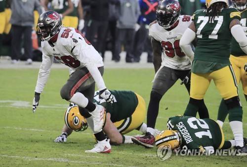 epa08963292 Tampa Bay Buccaneers linebacker Shaquil Barrett (L) celebrates after sacking Green Bay Packers quarterback Aaron Rodgers (R) in the fourth quarter of their NFL NFC Championship game at Lambeau Field in Green Bay, Wisconsin, USA, 24 January 2021. The winner will go on to face either the Buffalo Bills or the Kansas City Chiefs in Super Bowl LV in Tampa Bay, Florida on 07 February 2021. EPA/TANNEN MAURY