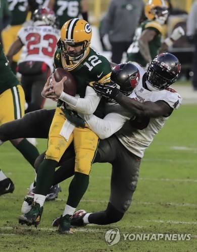 epa08963293 Tampa Bay Buccaneers linebackers Shaquil Barrett (R) and Jason Pierre-Paul (C) sack Green Bay Packers quarterback Aaron Rodgers (L) in the fourth quarter of their NFL NFC Championship game at Lambeau Field in Green Bay, Wisconsin, USA, 24 January 2021. The winner will go on to face either the Buffalo Bills or the Kansas City Chiefs in Super Bowl LV in Tampa Bay, Florida on 07 February 2021. EPA/TANNEN MAURY