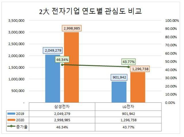 조사 결과 '삼성전자'를 키워드로 한 포스팅 수는 2019년 204만 9279건에서 2020년 299만8985건으로 94만9706건 46.34% 급증했으며, 'LG전자'는 2019년 90만1942건에서 2020년 129만 6738건으로 39만4796건 43.77% 크게 늘었다.