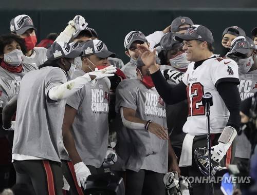 epa08963318 Tampa Bay Buccaneers quarterback Tom Brady holds the George Halas Trophy after defeating the Green Bay Packers in their NFL NFC Championship game at Lambeau Field in Green Bay, Wisconsin, USA, 24 January 2021. The Buccaneers will go on to face either the Buffalo Bills or the Kansas City Chiefs in Super Bowl LV in Tampa Bay, Florida on 07 February 2021. EPA/TANNEN MAURY