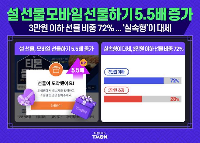 티몬이 최근 2주간(1월 11일~24일)고객들의 설 선물 구매 추이를 조사한 결과 모바일 선물하기 기능을 통한 주문은 지난해 설을 앞둔 동기간 대비 452% 급증했다. 또 응답자의 72%는 3만원 이하 상품을 찾는 것으로 나타나, 지난해(65%)보다 실속형 상품의 구매 경향이 두드러졌다.