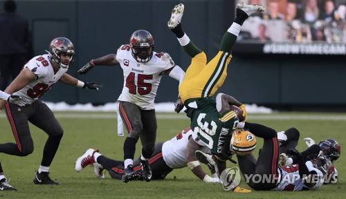 epaselect epa08963274 Green Bay Packers running back Jamaal Williams is upended on a tackle by the Tampa Bay Buccaneers in the third quarter of their NFL NFC Championship game at Lambeau Field in Green Bay, Wisconsin, USA, 24 January 2021. The winner will go on to face either the Buffalo Bills or the Kansas City Chiefs in Super Bowl LV in Tampa Bay, Florida on 07 February 2021. EPA/TANNEN MAURY