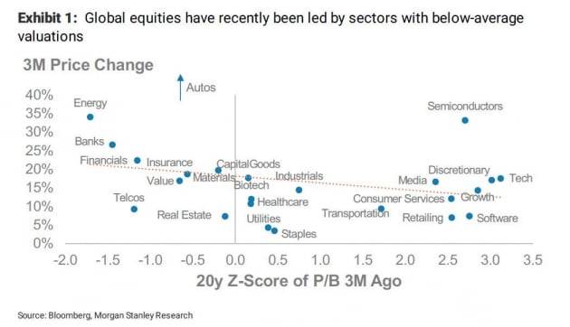 자동차 에너지 금융주 등 최근 3개월간 세계 증시에서 급등한 주식은 대부분 밸류에이션이 낮았던 주식으로 나타났다. 같은 기간 급등한 주식 중 시장 평균보다 비쌌던 주식은 반도체 뿐으로 분석됐다.