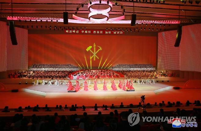 (평양 조선중앙통신=연합뉴스) 북한 8차 당대회 경축 공연인 '당을 노래하노라'가 평양체육관에서 13일부터 24일까지 진행됐다고 조선중앙통신이 25일 보도했다. 2021.1.25