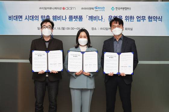 온라인 증명발급 솔루션 기업 ㈜아이앤텍은 지난 14일 디딤커뮤니케이션, 한국교원캠퍼스와 비대면 시대 맞춤 웨비나 플랫폼인 ‘깨비나’ 운영을 위한 업무 협약을 체결했다.
