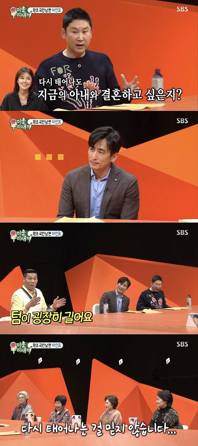 이날 MC 신동엽은 "예전에 신애라씨 나왔을 때도 비슷한 질문을 했다. 다시 태어나도 지금 아내(신애라)와 결혼하고 싶은가"라고 물었다. 차인표가 머뭇거리자 MC 서장훈은 "생각보다 텀이 굉장히 길다"라며 놀렸고 신동엽은 "지금 사랑하는 거와 다른 거다"라며 재밌어했다.