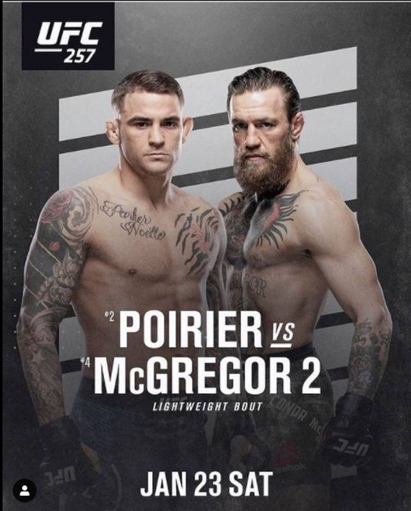 UFC 라이트급 랭킹 4위 코너 맥그리거는 24일(이하 한국시각) 아랍에미리트 아부다비의 에티하드 아레나에서 열린 UFC 257 메인이벤트에서 랭킹 2위 더스틴 포이리에에게 2라운드 2분32초 만에 펀치 KO로 무너졌다. 격투기 데뷔 후 서브미션으로만 4패를 당했던 맥그리거는 포이리에를 상대로 생애 첫 KO패를 당하며 자존심에 큰 상처를 입었다.