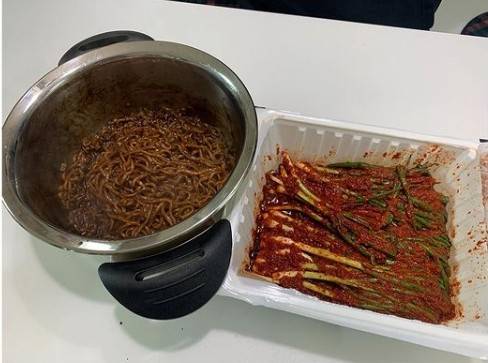 공개된 사진 속에는 김영희가 직접 끓인 짜장라면과 파김치가 담겨 있다.