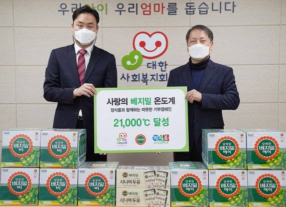 이번 캠페인은 지난해 12월 12일부터 31일까지 총 21일간 진행됐으며 전년(2020개) 대비 10배 이상인 2만1000개의 목표개수를 달성했다. 기부된 2만1000여개의 두유는 대한사회복지회와 희망브리지 전국재해구호협회를 통해 영유아시설, 아동시설, 노인복지관 등 도움이 필요한 많은 곳에 전달될 예정이다. 정식품은 지난 21일 대한사회복지회와 두유 전달식을 가졌으며 오는 26일에는 전국재해구호협회에 두유를 전달할 예정이다.