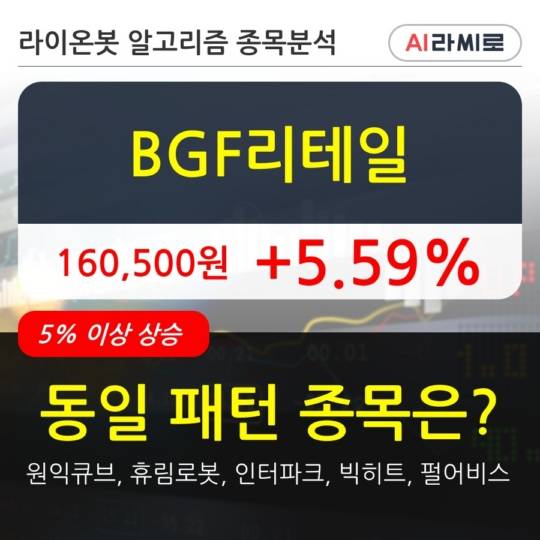 이 시각 거래소에서 BGF리테일 이외에도 원익큐브(5.59%), 휴림로봇(7.74%), 인터파크(12.38%), 빅히트(10.91%), 펄어비스(5.08%) 등이 상승세를 보이고 있다.