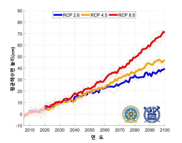 '기후변화에 관한 정부 간 협의체'(IPCC)의 기후변화 시나리오를 적용해 분석한 결과, 온실가스가 현재와 같은 수준으로 계속 배출되는 시나리오를 적용할 경우 2100년 우리나라 주변 해역의 해수면은 최대 73㎝까지 상승하는 것으로 예측됐다.