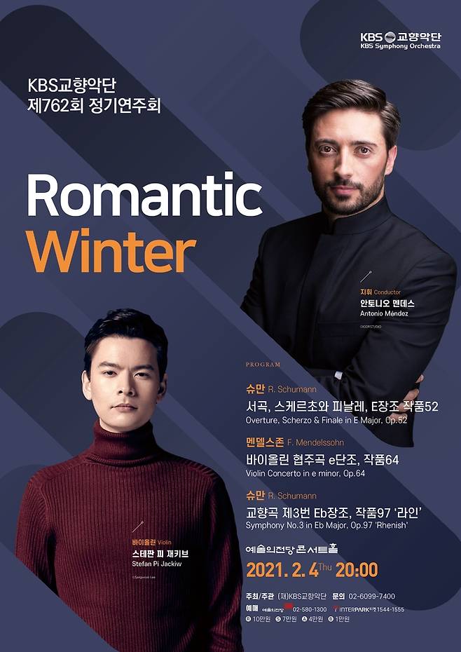 (서울=연합뉴스) 성도현 기자 = ▲ KBS교향악단 정기연주회 '로맨틱 윈터' = KBS교향악단이 다음 달 4일 오후 8시 서초구 예술의전당 콘서트홀에서 '로맨틱 윈터'(Romantic Winter)를 주제로 올해 첫 정기연주회를 연다.