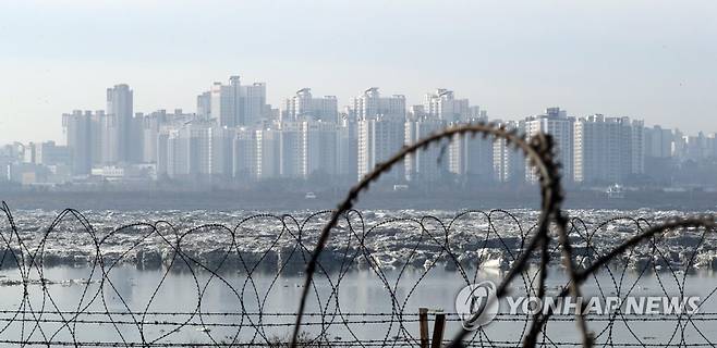 (파주=연합뉴스) 백승렬 기자 = 서울 낮 기온이 영상 11도까지 올라갈 것으로 예보된 25일 오전 경기도 파주시를 지나는 한강에 유빙이 떠내려가고 있다. 강 건너편은 김포시 한강신도시이다. 2021.1.25