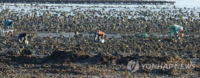 (강진=연합뉴스) 조근영 기자 = 봄처럼 포근한 날씨가 이어진 25일 전남 강진군 신전면 사초리 인근 청정해역 강진만(灣) 바닷가에서 이른 아침부터 자연산 석화(石花) 채취에 나선 어부들의 손놀림이 분주하다. 2021.1.25 [강진군 제공·재판매 및 DB 금지]