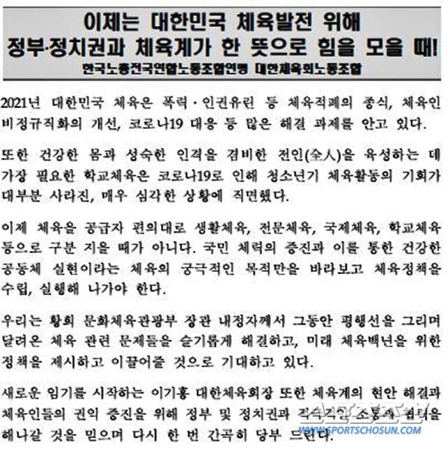 ◇대한체육회 노동조합 성명서: 체육발전 위해 정부·정치권과 체육계가 한 뜻으로 힘을 모을 때
