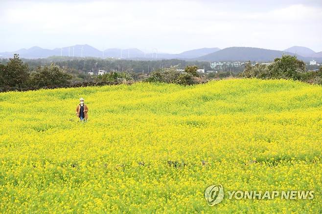 (서귀포=연합뉴스) 박지호 기자 = 제주지역 아침 기온이 12도를 훌쩍 넘어간 25일 오전 서귀포시 성산읍 성산리의 한 밭에 유채꽃이 활짝 피어 눈길을 끌고 있다. 2021.1.25