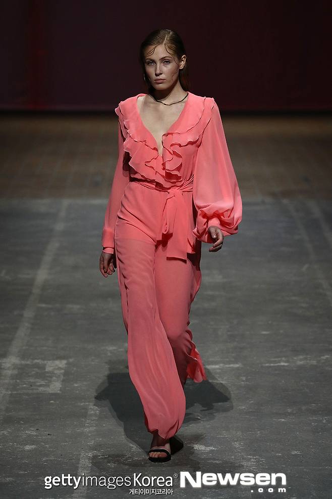 모델 엠이 1월 18일(현지시간) 독일 베를린크라프트베르크 미테에서 열린 메르세데스-벤츠 패션 위크 베를린에서 '라나 뮬러' 쇼에서 워킹을 하고 있다.