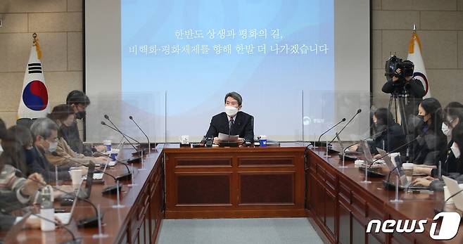 (서울=뉴스1) 유승관 기자 = 이인영 통일부 장관이 25일 서울 종로구 남북회담본부에서 출입기자단 간담회를 갖고 취재진 질문에 답하고 있다. 2021.1.25/뉴스1