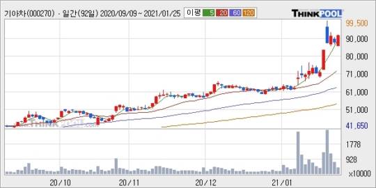 기아차, 장중 반등세, 전일대비 +5.01%.. 외국인 -244,453주 순매도 중