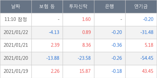 11시 10분 잠정집계에 따르면, 외국인은 기아차를 -244,453주 순매도하고 있고 기관은 14,000주 순매수 중이다. 기관 중에 투자신탁과 은행의 자금이 유입되었다.