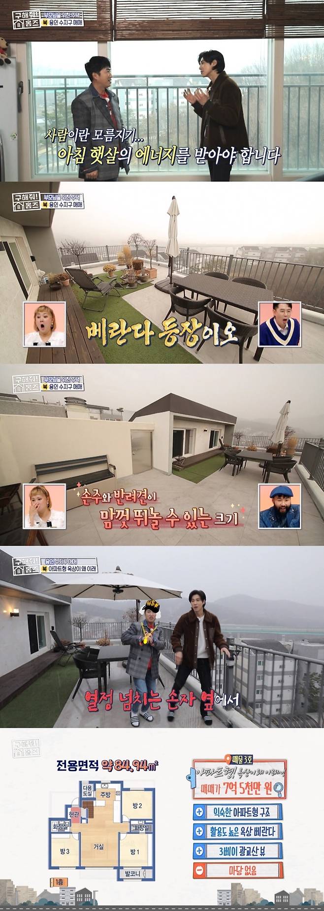 마지막으로 복팀은 용인시 수지구에 위치한 ‘아파트형~옥상이 왜 이래~!’를 소개했다. 아파트와 주택의 장점만 모아놓은 도시형 생활주택으로 펜트하우스 세대였다. 정남향의 매물은 3베이 구조로 집안의 모든 공간에 채광이 가득했다. 탑층 펜트하우스만이 누릴 수 있는 야외 옥상에서는 광교산 파노라마 뷰를 감상할 수 있었다.
