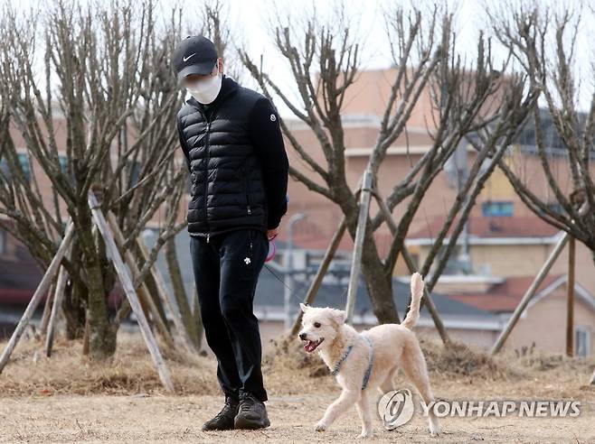 (전주=연합뉴스) 나보배 기자 = 평년보다 포근한 날씨를 보인 25일 낮 전북 전주시 완산구 문학대공원에서 한 시민이 강아지와 함께 산책하고 있다. 2021.1.25