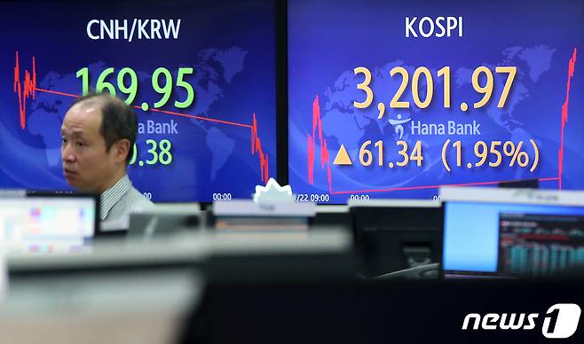 (서울=뉴스1) 오대일 기자 = 코스피가 기관 투자자의 매수세에 힘 입어 장중 3,200선을 돌파한 25일 오후 서울 중구 하나은행 딜링룸 전광판의 코스피 지수가 3,201.97을 나타내고 있다. 2021.1.25/뉴스1
