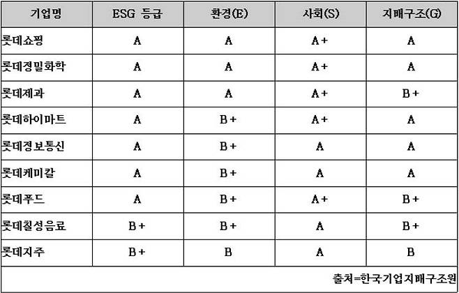 롯데그룹 계열사간 ESG(환경·사회·지배구조) 등급 평가가 엇갈렸다.