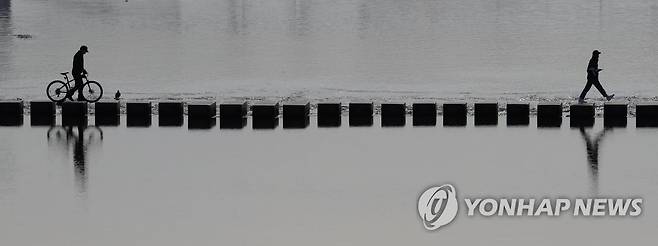 (서울=연합뉴스) 백승렬 기자 = 기온이 풀리면서 낮 최고 기온이 영상 13도까지 올라간 25일 서울 중랑천에서 시민들이 나와 산책하며 징검다리를 건너고 있다. 2021.1.25