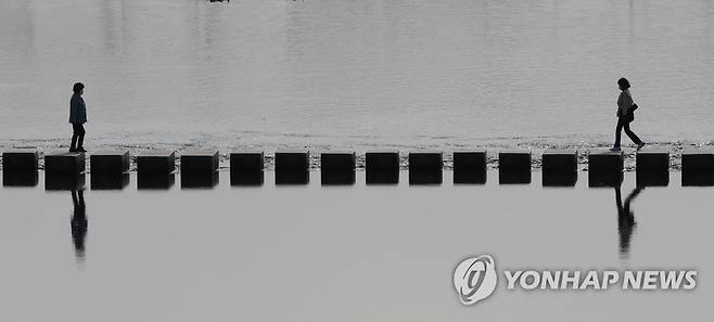 (서울=연합뉴스) 백승렬 기자 = 기온이 풀리면서 낮 최고 기온이 영상 13도까지 올라간 25일 서울 중랑천에서 시민들이 나와 산책하며 징검다리를 건너고 있다. 2021.1.25