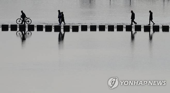 (서울=연합뉴스) 백승렬 기자 = 기온이 풀리면서 낮 최고 기온이 영상 13도까지 올라간 25일 서울 중랑천에서 시민들이 나와 산책하며 징검다리를 건너고 있다. 2021.1.25
