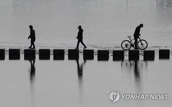 (서울=연합뉴스) 백승렬 기자 = 기온이 풀리면서 낮 최고 기온이 영상 13도까지 올라간 25일 서울 중랑천에서 시민들이 나와 산책하며 징검다리를 건너고 있다. 2021.1.25
