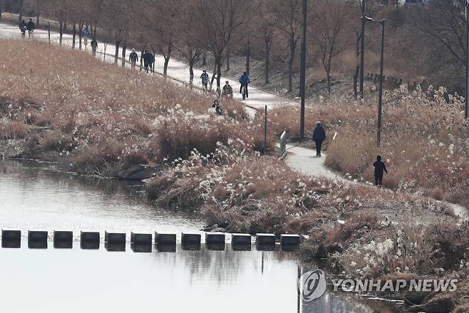 (서울=연합뉴스) 백승렬 기자 = 기온이 풀리면서 낮 최고 기온이 영상 13도까지 올라간 25일 서울 중랑천 공원에서 시민들이 나와 산책하고 있다. 2021.1.25