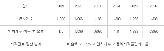 신규 징수규정은 OTT 서비스 가운데 음악이 부수적으로 이용되는 영상물(예능, 드라마, 영화 등)의 경우 매출의 1.5%(2021년)를 징수율로 정했다. 여기에 연차계수를 적용, 점차 요율을 높여 오는 2026년 이후에는 1.9995%를 유지하도록 했다.