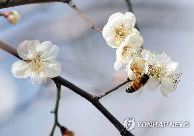 (창원=연합뉴스) 김동민 기자 = 경남지역 최고기온이 15도까지 오르는 등 포근한 날씨를 보인 25일 오후 경남 창원시 마산합포구 월포동 한 아파트 단지 내 매화나무에서 벌 한마리가 식사하고 있다. 2021.1.25