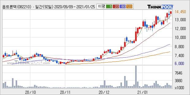 '옵트론텍' 52주 신고가 경신, 단기·중기 이평선 정배열로 상승세