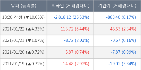13시 20분 잠정집계에 따르면, 대한전선은 외국인과 기관이 각각 -28,181,206주, -8,684,000주를 순매도 중이다.